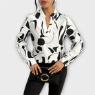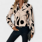 Blusa Elegante da Eline - Esta blusa une estilo clássico com um toque moderno, graças aos padrões geométricos pretos em um fundo bege. Feita de poliéster leve, é ideal para a primavera, verão e outono.
