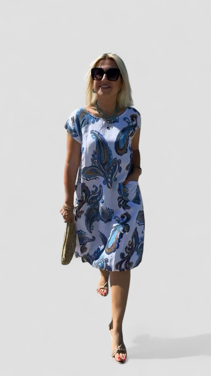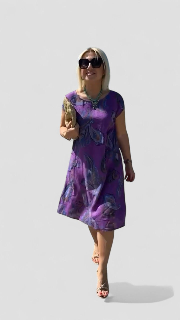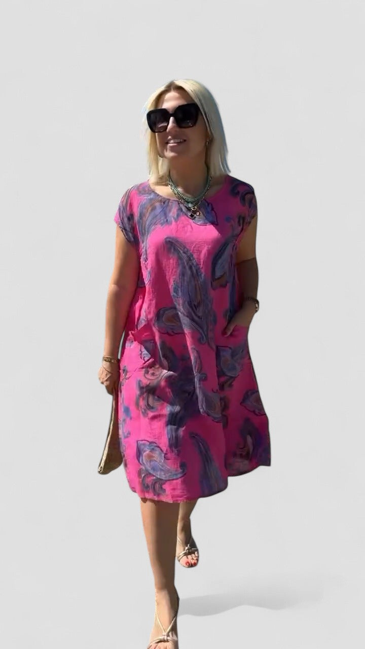 O vestido perfeito para quem quer um look descontraído sem abdicar do estilo. Com um corte solto, tecido leve e um padrão artístico em tons lilás e azul sobre rosa vibrante, este modelo traduz o espírito livre do verão. Ideal para passeios à beira-mar, tardes entre amigas ou dias relaxados com um toque de cor.