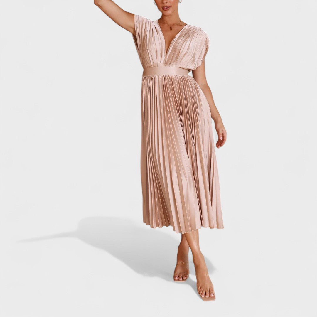 Este vestido franzido, com decote em V profundo e corte fluido, é o exemplo perfeito de como o minimalismo pode ser absolutamente deslumbrante. Ideal para ocasiões especiais ou jantares elegantes, ele realça a silhueta com um caimento leve e sofisticado, fazendo com que se sinta confiante e elegante sem esforço.