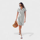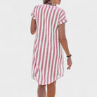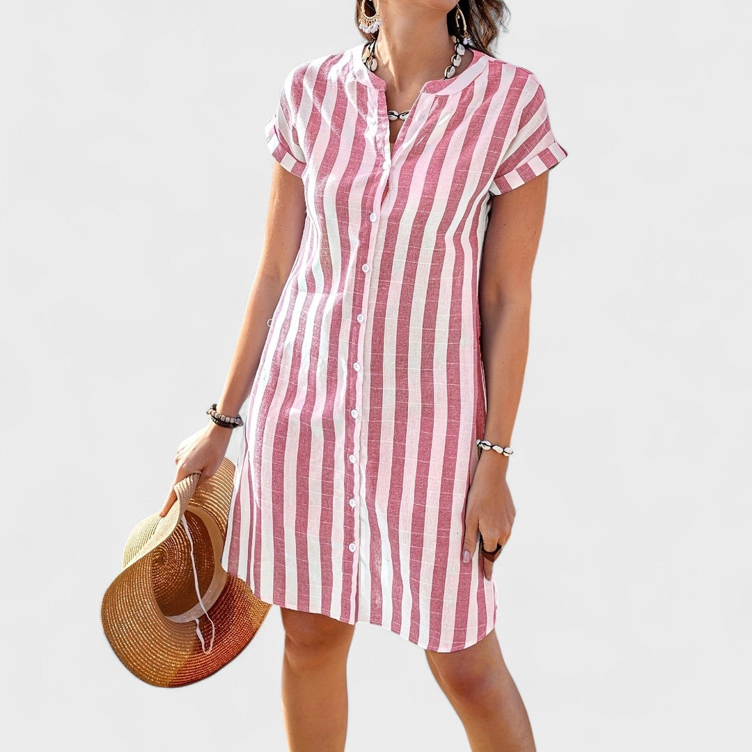Fresco, leve e sempre pronto para acompanhar o teu dia — este vestido é a escolha perfeita para quem procura simplicidade com estilo. Com um corte descontraído e botões frontais, adapta-se facilmente a passeios, férias ou momentos de lazer com charme natural.