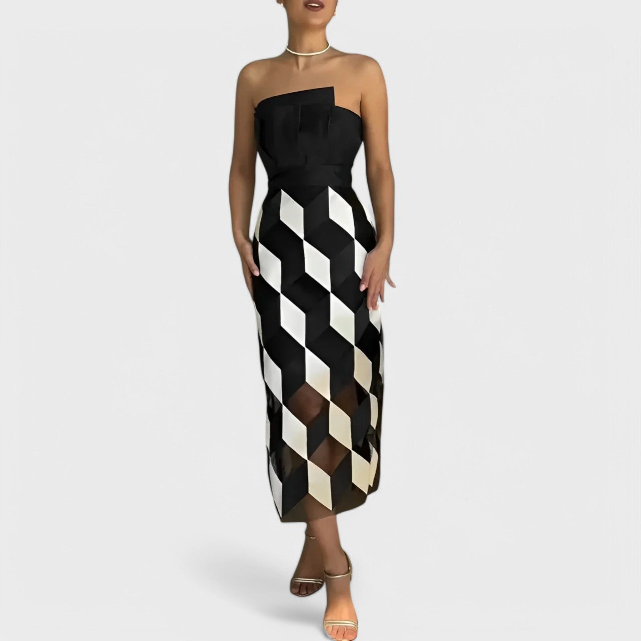 Sofisticação e modernidade encontram-se neste Vestido Midi Geométrico Elegance. Com um design cai-cai, valoriza a silhueta com elegância, enquanto a estampa em preto e branco com padrões geométricos cria um efeito visual impactante e requintado.