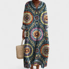 Inspirado no estilo boémio, este vestido maxi é uma verdadeira obra de arte feita de tecido. Com o seu corte amplo e fluido, proporciona liberdade e frescura em cada movimento. Com um padrão de blocos de cores vibrantes e linhas assimétricas, destaca o estilo e a individualidade a cada passo.